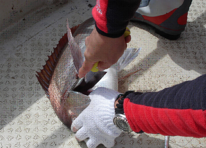 マダイをサバキ3を使用して〆る。スムーズにポイントが入り中骨が断たれる。サビナイフ1を使用 さすがに小型のためポイントを入れる際、グリップを手のひらで包み込むような握りになるが、ポイントの入りは悪くはない。ただし、サビナイフ1を使用するのは40センチくらいまでと考えたほうがいいようである。上の写真の続き中骨を断つのにちょっと手こずっている。尾の付け根は、思ったよりもすんなり切断できました。